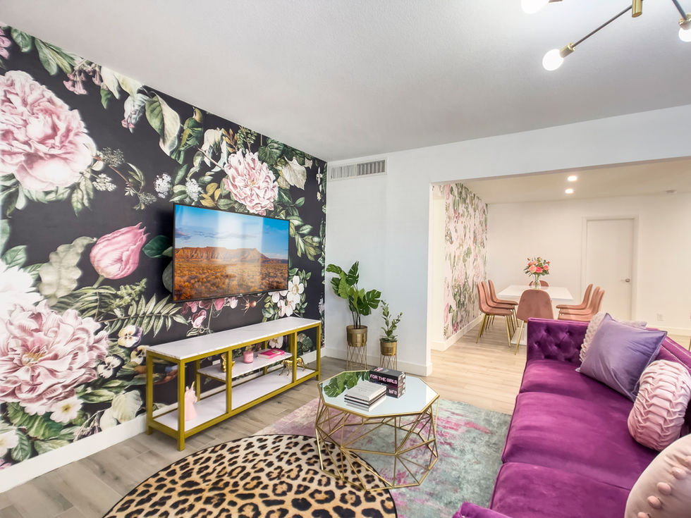A collection of stylish living spaces with floral wallpaper, pink and teal accents, and modern decor elements.